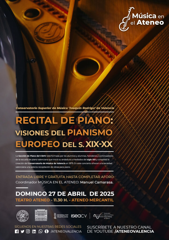 La Fundación del Ateneo Mercantil de la Comunidad Valenciana tiene el placer de invitarle a una nueva cita del Ciclo Música en el Ateneo, con un concierto gratuito protagonizado por el alumnado de Piano del Conservatorio Superior de Música “Joaquín Rodrigo” de Valencia.