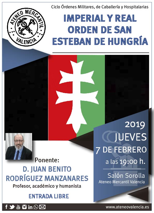 La siguiente orden del Ciclo Órdenes Militares, de Caballería y Hospitalarias que pasará por el Salón Sorolla del Ateneo Mercantil será la Imperial y Real orden de San Esteban de Hungría. De nuevo la ponencia correrá a cargo del profesor, académico y humanista D. Juan Benito Rodríguez Manzanares. Recrodarles que es Gratuita y Abierta al público y que será el próximo jueves 7 de febrero.