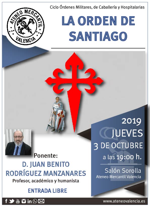 Tras las vacaciones de verano el Ciclo de las Órdenes Militares y Hospitalarias reanuda sus conferencias con la Orden de Santiago. La ponencia será el próximo jueves 3 de octubre a las 19 horas en el Salón Sorolla y será impartida por el profesor, humanista y escritor, D. Juan Benito Rodríguez Manzanares. La Orden de Santiago es una orden religiosa y militar surgida en el siglo XII en el Reino de León. Debe su nombre al patrón de España, Santiago el Mayor. Su objetivo inicial era proteger a los peregrinos del Camino de Santiago y expulsar a los musulmanes de la península ibérica.