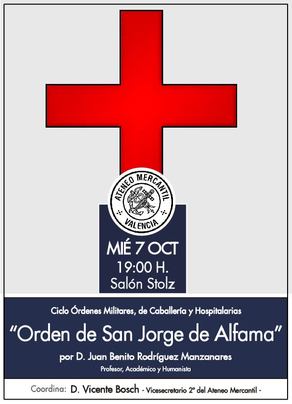 El próximo miércoles 7 de octubre a las 19.00 horas llega al Salón Stolz una nueva edición del Ciclo Órdenes de Caballería, Militares y Hospitalarias con la Orden de San Jorge de Alfama y que traerá una vez el ponente habitual, el profesor, académico y humanista, D. Juan Benito Rodríguez Manzanares.