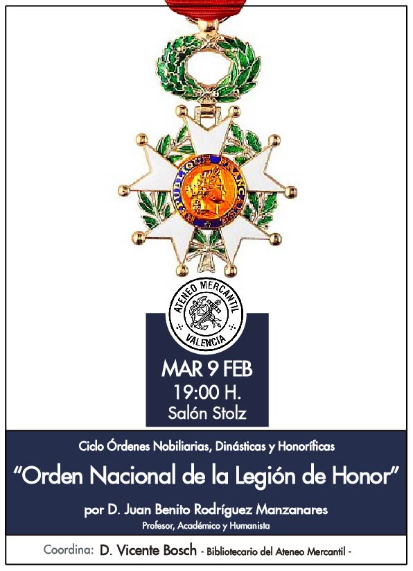 El próximo martes 9 de febrero a las 19 horas llega una nueva reunión del Ciclo Órdenes Nobiliarias, Dinásticas y Honoríficas con la conferencia online "Orden Nacional de la Legión de Honor" que impartirá el profesor, académico y humanista, D. Juan Benito Rodríguez Manzanares.