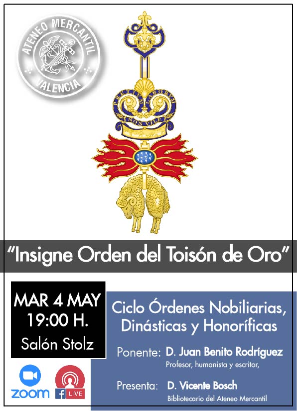 La próxima reunión del Ciclo de Órdenes Nobiliarias, Dinásticas y Honoríficas será el martes 4 de mayo a las 19 horas en el Salón Stolz del Ateneo Mercantil y a su vez se dará la coferencia en online mediante la plataforma Zoom. La siguiente orden en desfilar por nuestra institución será la Insigne Orden del Toisón de Oro y el ponente será de nuevo el profesor, humanista y escritor, D. Juan Benito Rodríguez Manzanares.