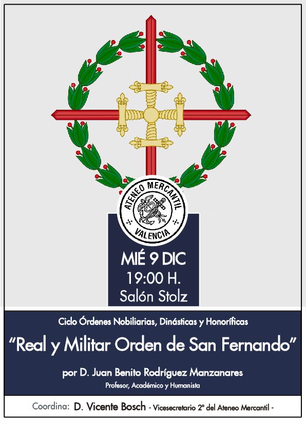 Una vez acabado el anterior Ciclo de Órdenes Militares y Humanitarias, llega ahora el Ciclo de Órdenes Nobiliarias y éste arranca con una conferencia sobre la "Real y Militar Orden de San Fernando". La ponencia será el próximo miércoles 9 de diciembre a las 19 horas en el Salón Stolz y será impartida por el profesor, humanista y escritor, D. Juan Benito Rodríguez Manzanares.