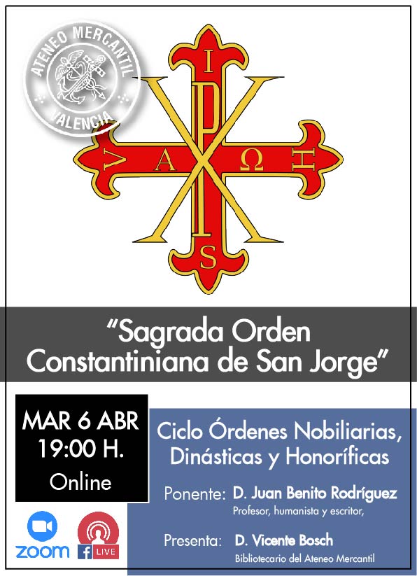 La próxima conferencia del Ciclo Órdenes Nobiliarias, Dinásticas y Honoríficas se celebrará el próximo martes 6 de abril en el Ateneo Mercantil y será retransmitida online por la plataforma zoom. La orden que se desgranará será la "Sagrada Orden Constantiniana de San Jorge" y el ponente será el profesor, humanista y escritor, D. Juan Benito Rodríguez Manzanares.