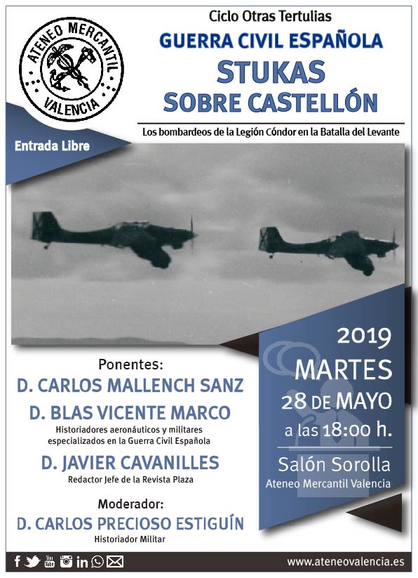 Se cumplen 80 años del fin de la Guerra Civil Española y el Ateneo Mercantil de Valencia trae al Salón Sorolla un episodio que ha resultado complejo como el 'Experimento Stuka'. El próximo 28 de mayo a las 18 horas llega la conferencia "Guerra Civil: Stukas sobre Castellón" en la que el historiador militar, D. Carlos Precioso, ejercerá de moderador en una mesa redonda que traerá a dos especialistas de la Guerra Civil e historiadores aeronáuticos y militares y a un periodista para tratar de esclarecer el bombardeo de la Legión Condor en cuatro pueblos de Castellón.