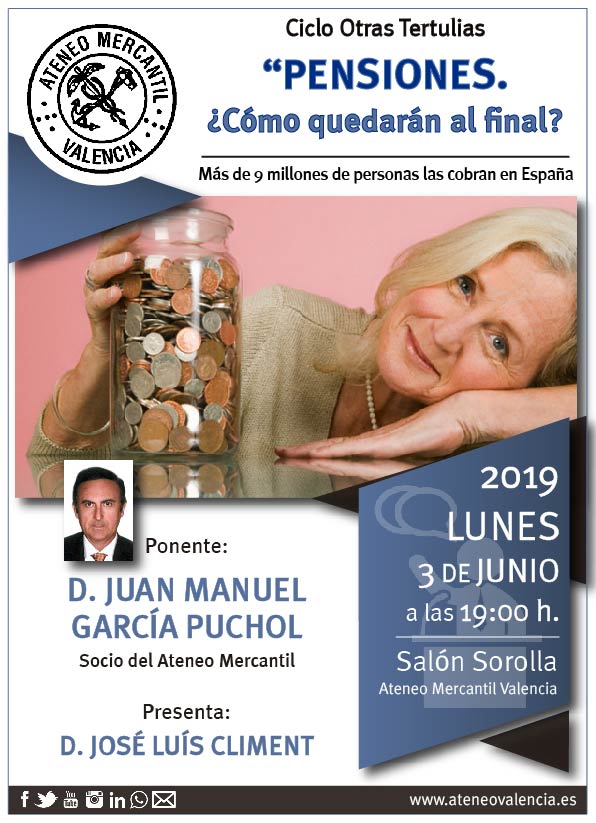 El Ciclo Otras Tertulias llega el próximo lunes 3 de junio a las 19 horas al Salón Sorolla con una conferencia en la que se tratará el tema de las pensiones, tras suspenderse hace unas semanas. El socio ateneísta, D. Juan Manuel García Puchol será el ponente de una conferencia en la que se informará del futuro de las pensiones en nuestro país. Los economistas lo único que pueden es analizar los datos económicos pasados y presentes, y desde ese punto de partida usar predicciones de variables a futuro y llegar a conclusiones. El número de pensiones que se cobran en España es de más de 10 millones.