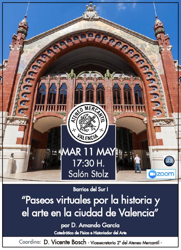 Décimo tercera sesión del nuevo ciclo que llega al Ateneo Mercantil de Valencia sobre "Paseos virtuales por la historia y el arte de la ciudad de Valencia". En esta conferencia se tratarán los "Barrios del Sur I" y de nuevo actuará de ponente D. Amando García, que es catedrático de Física e Historiador del Arte.