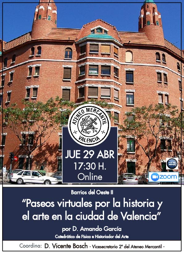 Duodécima sesión del nuevo ciclo que llega al Ateneo Mercantil de Valencia sobre "Paseos virtuales por la historia y el arte de la ciudad de Valencia". En esta conferencia se tratarán los "Barrios del Oeste II" y de nuevo actuará de ponente D. Amando García, que es catedrático de Física e Historiador del Arte.