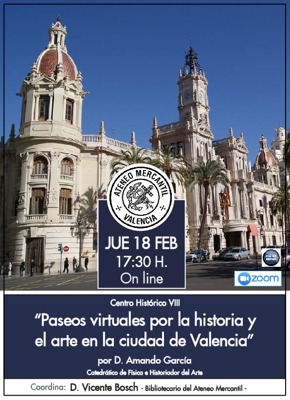 Octava sesión del nuevo ciclo que llega al Ateneo Mercantil de Valencia sobre "Paseos virtuales por la historia y el arte de la ciudad de Valencia". En esta conferencia se tratará el "Centro Histórico VIII" y de nuevo actuará de ponente D. Amando García, que es catedrático de Física e Historiador del Arte.