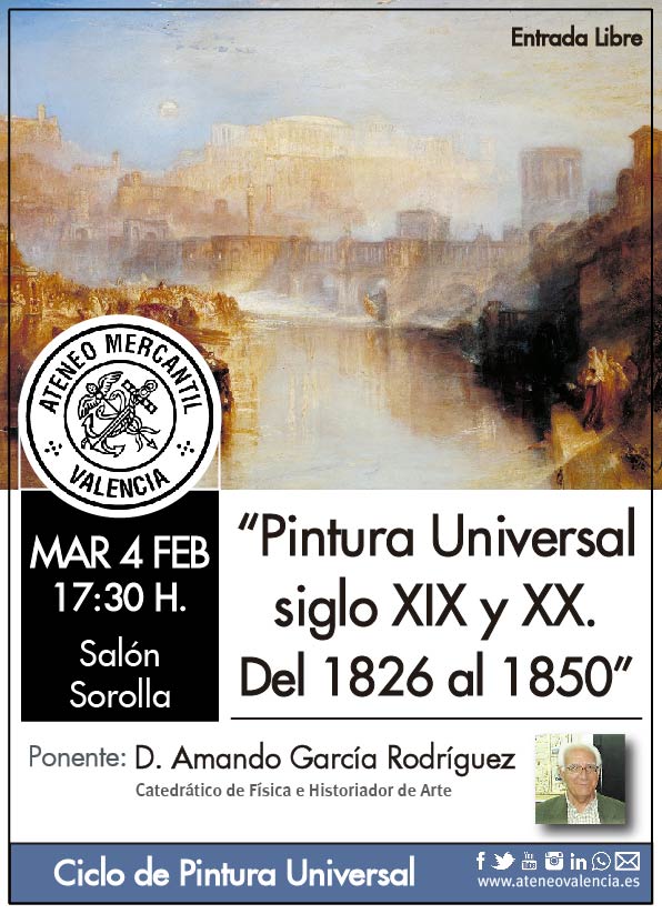 Segunda sesión del nuevo ciclo en el Ateneo Mercantil sobre Pintura Universal de los siglos XIX y XX y que trae el profesor D. Amando García que es un habitual de la pintura y de la historia del Arte en nuestra casa. Serán clases magistrales desarrollando y explicando cuadros pintados cada 25 años. En esta segunda conferencia se abordará la pintura que abarca los años 1826 al 1850.