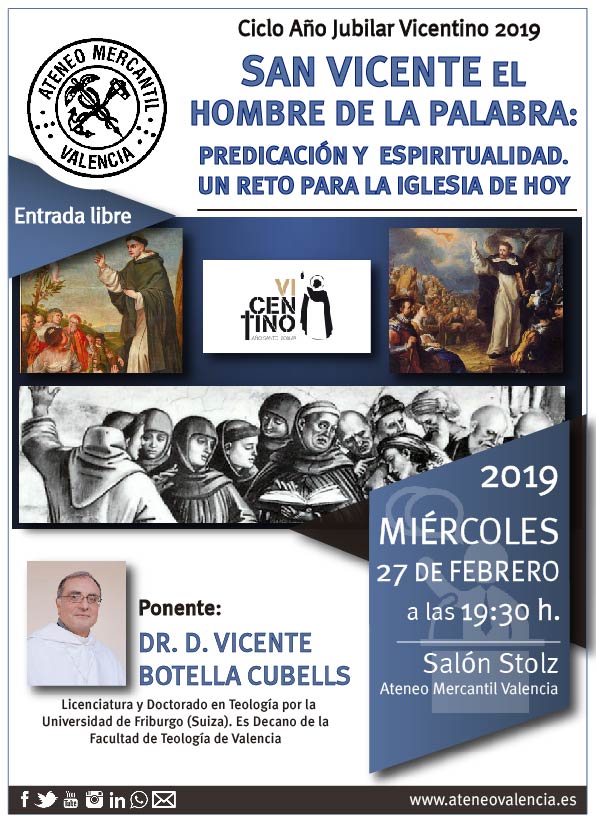Tercera de las conferencias que componen el Ciclo del Año Jubilar Vicentino 2019, que llega bajo el título: "San Vicente el hombre de la palabra: Predicación y Espiritualidad. Un reto para la Iglesia de hoy" y que impartirá el Licenciatura y Doctorado en Teología por la Universidad de Friburgo (Suiza) y Decano de la Facultad de Teología de Valencia, el Dr. D. Vicente Botella Cubells. La conferencia será el próximo 27 de febrero de 2019, a las 19.30 horas en el Salón Stolz y la entrada es Libre y Gratuita para el público.