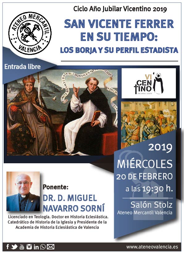 Segunda de las conferencias que componen el Ciclo del Año Jubilar Vicentino 2019, que llega bajo el título: "San Vicente Ferrer en su tiempo: Los Borja y su perfil 'estadista'" y que impartirá el Licenciado en Teología. Doctor en Historia Eclesiástica. Catedrático de Historia de la Iglesia y Presidente de la Academia de Historia Eclesiástica de Valencia, Dr. D. Miguel Navarro Sorní. La conferencia será el próximo 20 de febrero de 2019, a las 19.30 horas en el Salón Stolz y la entrada es Libre y Gratuita para el público.