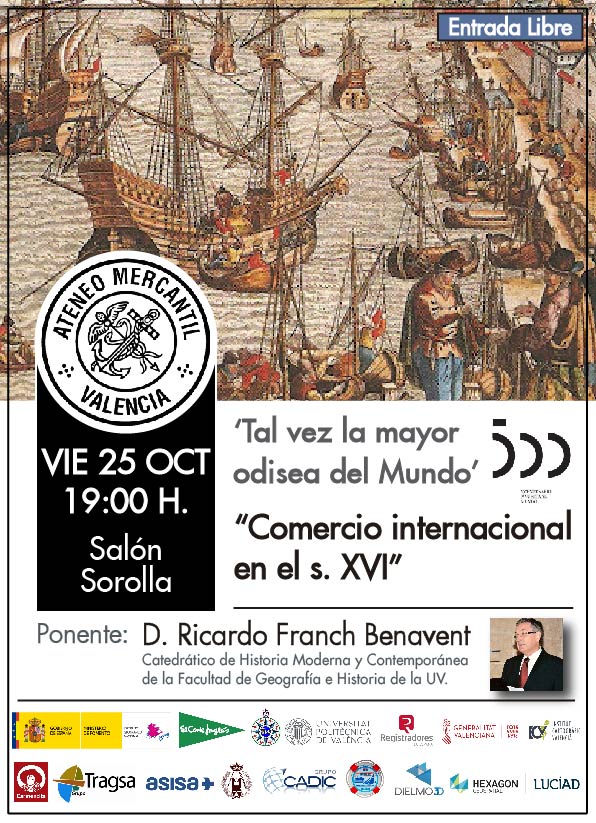 La segunda conferencia del Ciclo 'Tal vez la mayor odisea del Mundo' que conmemora el V Centenario de la que fue tal vez la mayor odisea del mundo, la primera circunnavegación de la Tierra de toda la historia y que fue llevada a cabo por Magallanes y Elcano; la ponencia viene bajo el título "Comercio internacional en el s. XVI", y viene a intentar contextualizar el momento en el que se produjo la expedición de Magallanes y Elcano intentando buscar qué les llevó a hacer esta travesía marítima y lo que es más importante en que se tradujo el descubrimiento de nuevos mercados internacionales con la llegada de nuevos países.