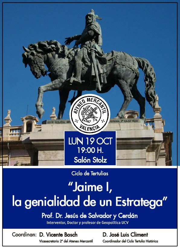 El próximo lunes 19 de octubre regresa el Ciclo de Tertulias con una nueva conferencia histórica sobre el rey D. Jaime. Una ponencia que será en el Salón Stolz (19 horas), que llega bajo el título: "Jaime I, la genialidad de un Estratega" y cuyo ponente será el Prof. Dr. Jesús de Salvador y Cerdán, profesor de Criminologia en la UCV y miembro Comité Científico del IEEI UCV, del Consejo Asesor UNESCO Ruta de la Seda y FOCAL POINT España y de la Asociación Valenciana de Historia Militar.