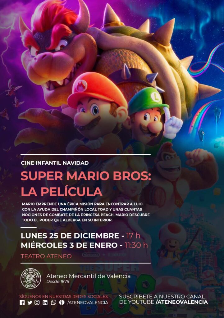 La primera de las películas que el Ateneo Mercantil ha programado estas Navidades para los niños y niñas de nuestros socios es "Super Mario Bros: La Película". El lunes 25 de diciembre a las 17 horas en el Teatro Ateneo se proyectará esta película animada dirigida por Aaron Horvath y Michael Jelenic. Una película de Illumination Entertainment, Nintendo y Universal Pictures muy esperada por todos los niños que se estrenó en cines el pasado mes de abril de 2023.