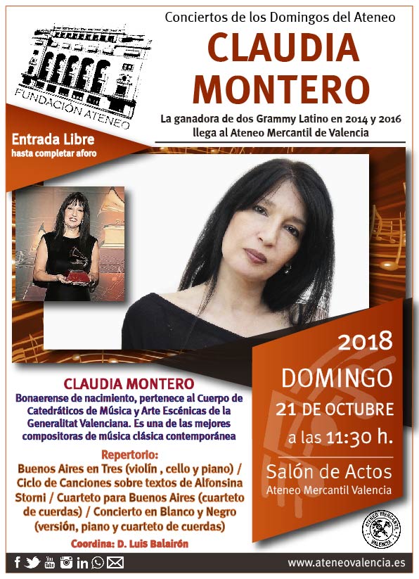 El siguiente concierto en el Ateneo Mercantil de Valencia será el próximo 21 de octubre a las 11.30 horas y traerá hasta el teatro de nuestra institución a la compositora argentina, Dª. Claudia Montero. Bajo el título 'Claudia Montero en Concierto' llega una de las mejores compositoras de América Latina, ganadora de dos Grammy Latino en 2014 y en 2016 por el 'Concierto para violín y orquesta' y 'Cuarteto para Buenos Aires', respectivamente. En el concierto en el Ateneo Mercantil interpretará Buenos Aires en Tres (violín, cello y piano); el Ciclo de Canciones sobre textos de Alfonsina Storni; Cuarteto para Buenos Aires (cuarteto de cuerdas) y Concierto en Blanco y Negro (versión, piano y cuarteto de cuerdas).