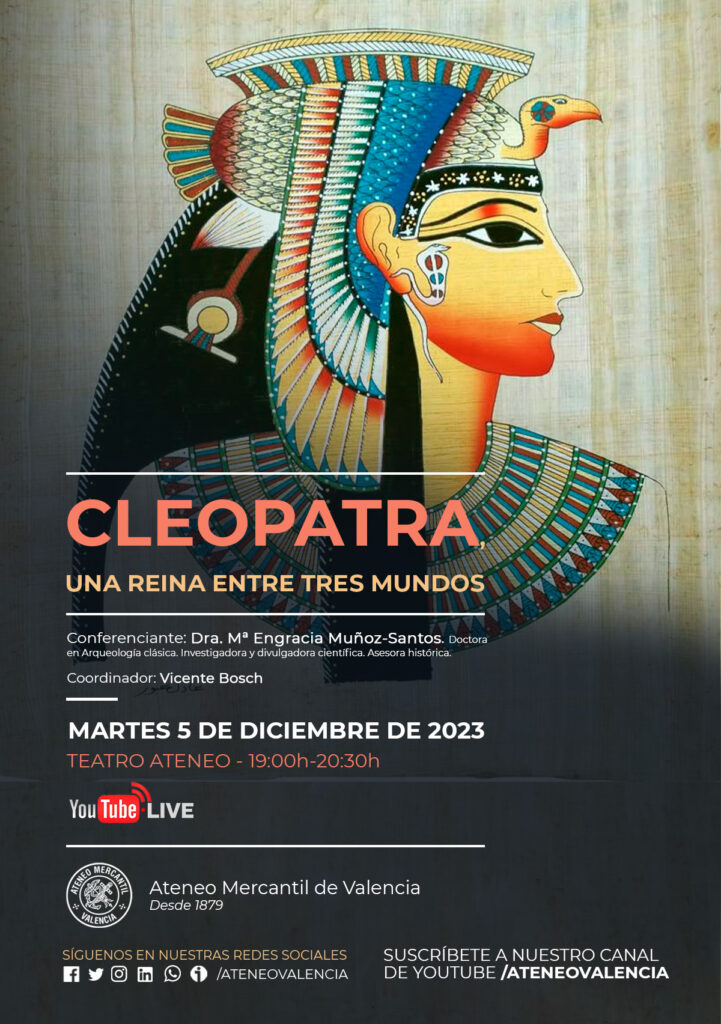Uno de los personajes históricos  que más ha revolucionado la historia, ya que ha levantado pasiones a lo largo de ella. Cleopatra, destinada a ser la última de su dinastía, la faraona egipcia utilizó la seducción y la astucia política para promover los intereses del antiguo Egipto frente a la expansión romana. Aunque es una de las mujeres más conocidas, tanto los historiadores como los arqueólogos no pueden decir mucho con seguridad sobre su figura, pero la Dra. Mª Engracia Muñoz-Santos nos trae todo lo que se sabe sobre esta legendaria y misteriosa reina.