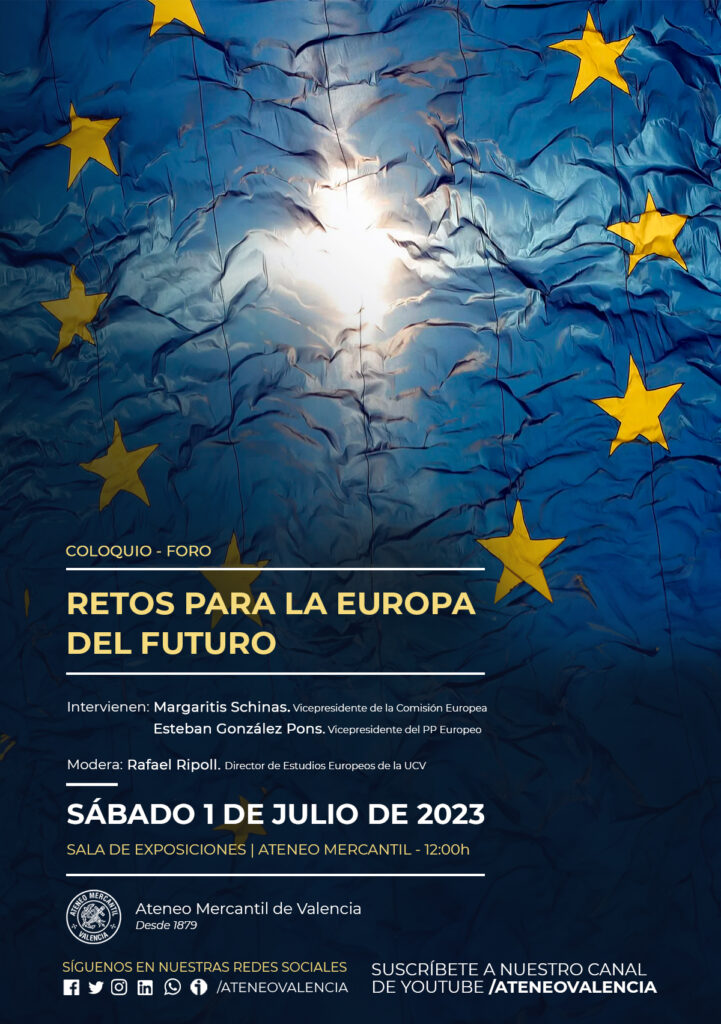 El Ateneo Mercantil de Valencia acogerá este sábado 1 de julio, a partir de las 12 horas en la Sala de Exposiciones, un coloquio bajo el título "Retos para la Europa del futuro" a cargo del Vicepresidente de la Comisión Europea, Margartitis Schinas y el Vicepresidente del Partido Popular Europeo, Esteban González Pons. El coloquio será moderado por Rafael Ripoll Navarro, Director del Instituto de Estudios Europeos de la Universidad Católica de Valencia.