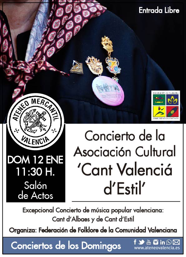 Los Conciertos de los Domingos regresan en este 2020 c0n una cita éste próximo 12 de enero a las 11.30 horas en el Salón de Actos del Ateneo Mercantil con la Asociación Cultural 'Cant Valenciá d'Estil' , que traerá un programa repleto de "Albaes i Cant d'Estil".
