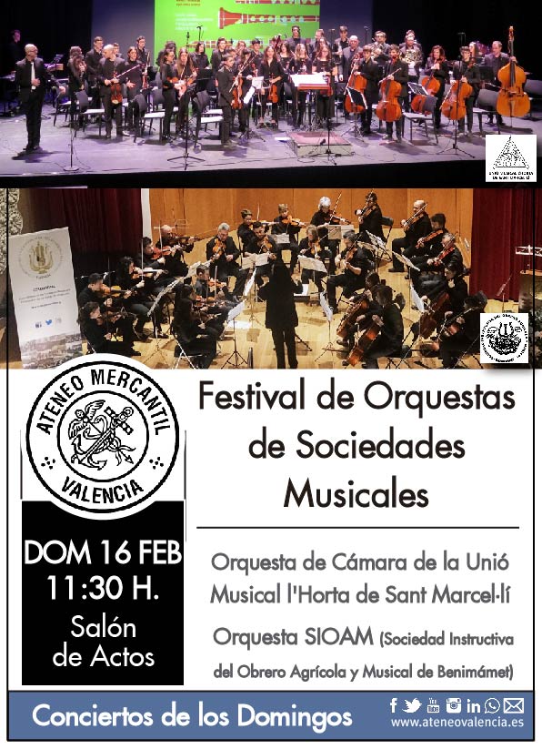 El Ateneo Mercantil de Valencia ha organizado un gran concierto el próximo domingo 16 de febrero a 11.30 horas en el Salón de Actos. Un Festival de Orquestas de Sociedades Musicales que será un encuentro de dos grandes orquestas como la Orquesta de Cámara de la Unió Musical l'Horta de Sant Marcel·lí y la Orquesta SIOAM, Sociedad Instructiva del Obrero Agrícola y Musical de Benimámet.
