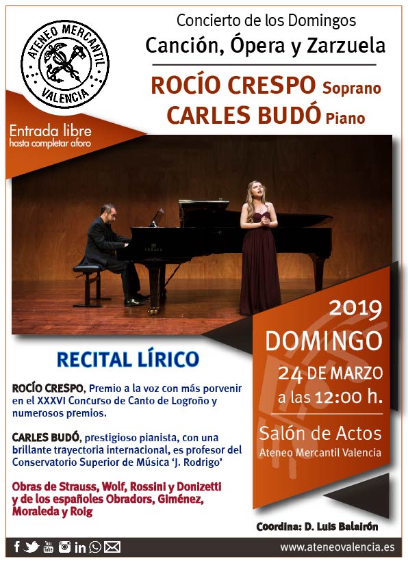 El primero de los conciertos de este domingo en el Ateneo Mercantil de Valencia será a las 12 horas de la mañana de manera excepcional y será un Recital Lírico de la soprano, Rocío Crespo y del pianista Carles Budó. Un concierto que será en el Salón de Actos y en el habrá Canciones, Ópera y Zarzuela. Este dueto ofrecerán un repertorio en el que hay obras de Strauss, Wolf, Rossini y Donizetti también de los españoles Obradors, Giménez, Moraleda y Roig.