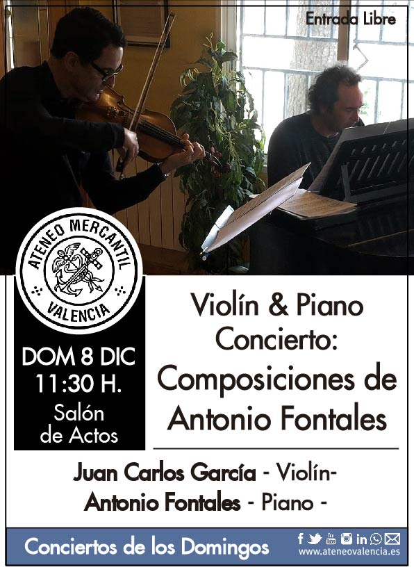 Nuevo concierto en el Salón de Actos dentro del programa de Conciertos de los Domingos en el Ateneo Mercantil. Llega este domingo 8 de diciembre a las 11.30 horas el "Violín & Piano Concierto: Composisiones de Antonio Fontales", del compositor y concertista de piano Antonio Fontales y del violinista, Juan Carlos García. Será un concierto abierto a toda la sociedad valenciana.