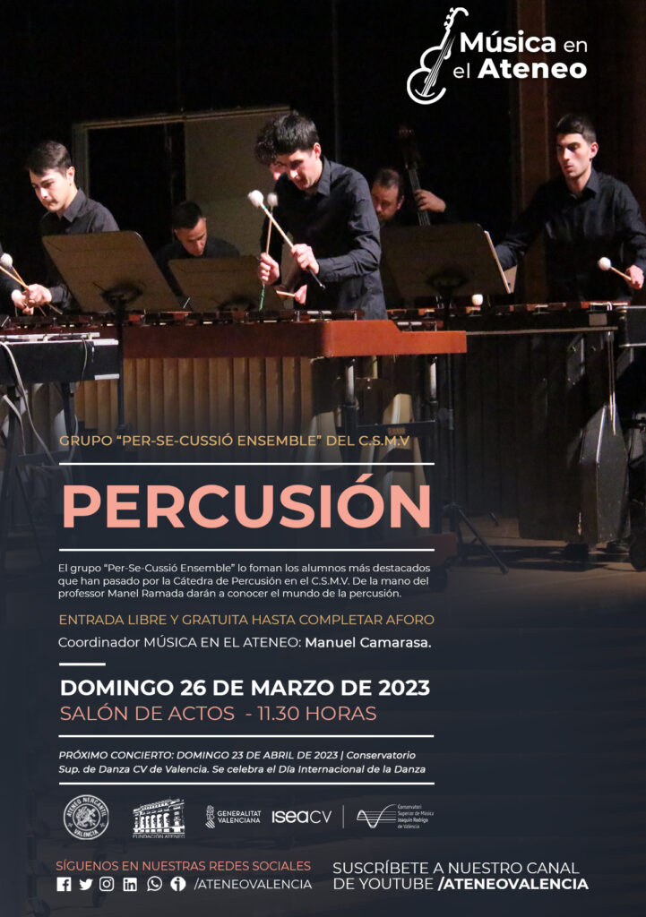 La Fundación del Ateneo Mercantil CV en colaboración con el Conservatorio Superior de Música "Joaquín Rodrigo" de Valencia organiza un concierto gratuito este domingo 26 de marzo a las 11.30 horas en el Salón de Actos del Ateneo Mercantil (Plaza del Ayuntamiento, 18 de Valencia). Será un concierto de percusión que ofrecerá el grupo "Per-Se-Cussió Ensemble", un grupo de alumnos y ex alumnos del Conservatorio Superior de Música "Joaquín Rodrigo" de Valencia que han realizado la Cátedra de Percusión.