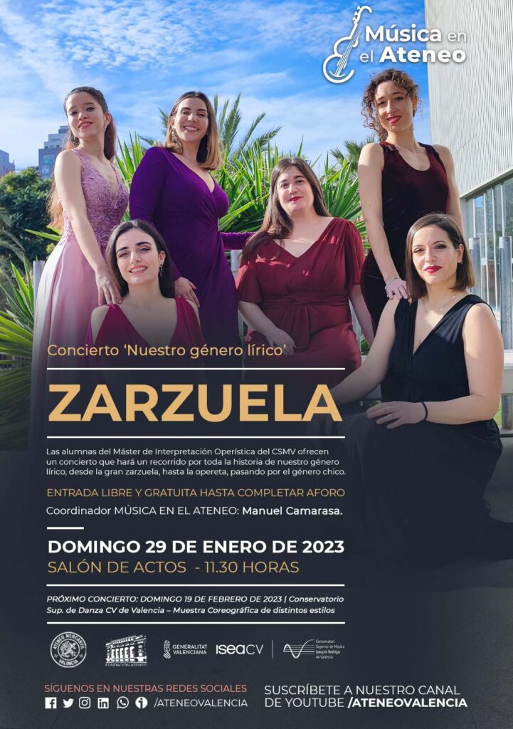 La Fundación Ateneo Mercantil de Valencia en colaboración con el Conservatorio Superior de Música 'Joaquín Rodrigo' de Valencia han programado un nuevo concierto gratuito dentro del ciclo 'Música en el Ateneo' para el próximo domingo 29 de enero de 2023 a las 11.30 horas en el Teatro Auditorio del Ateneo Mercantil. En esta ocasión las alumnas del Máster de Interpretación Operística del CSMV ofrecerán un concierto que hará un recorrido por toda la historia de nuestro género lírico, desde la gran zarzuela, hasta la opereta, pasando por el género chico.