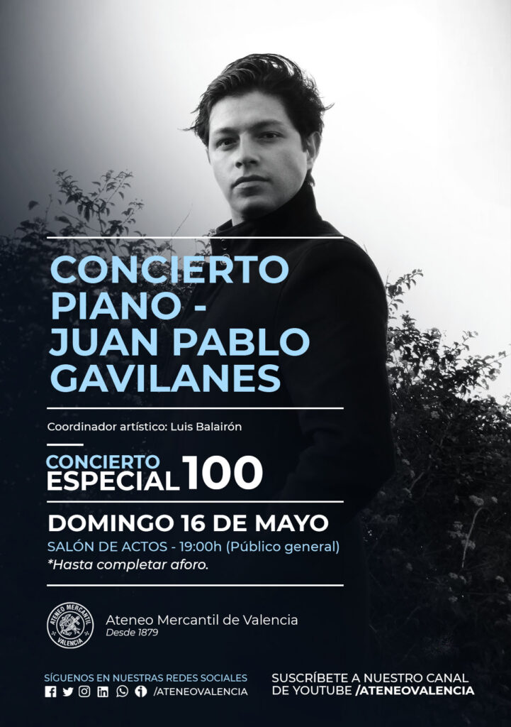 El Ciclo de Conciertos del Domingos llegan a su concierto 100 en la nueva época que dirige D. Luis Balairon y se ha programado un concierto especial de piano que traerá hasta Valencia, al pianista de clase mundial, D. Juan Pablo Gavilanes Almeida. Así el próximo domingo 16 de mayo a las 19 horas en el Salón de Actos del Ateneo Mercantil, el público valenciano tienen una cita muy especial con la música pianística, ya que este concertista es el máximo referente pianístico latinoamericano de su generación. La entrada es gratuita y libre hasta completar el aforo del teatro. Un concierto que, además, se emitirá en directo por la plataforma Zoom.