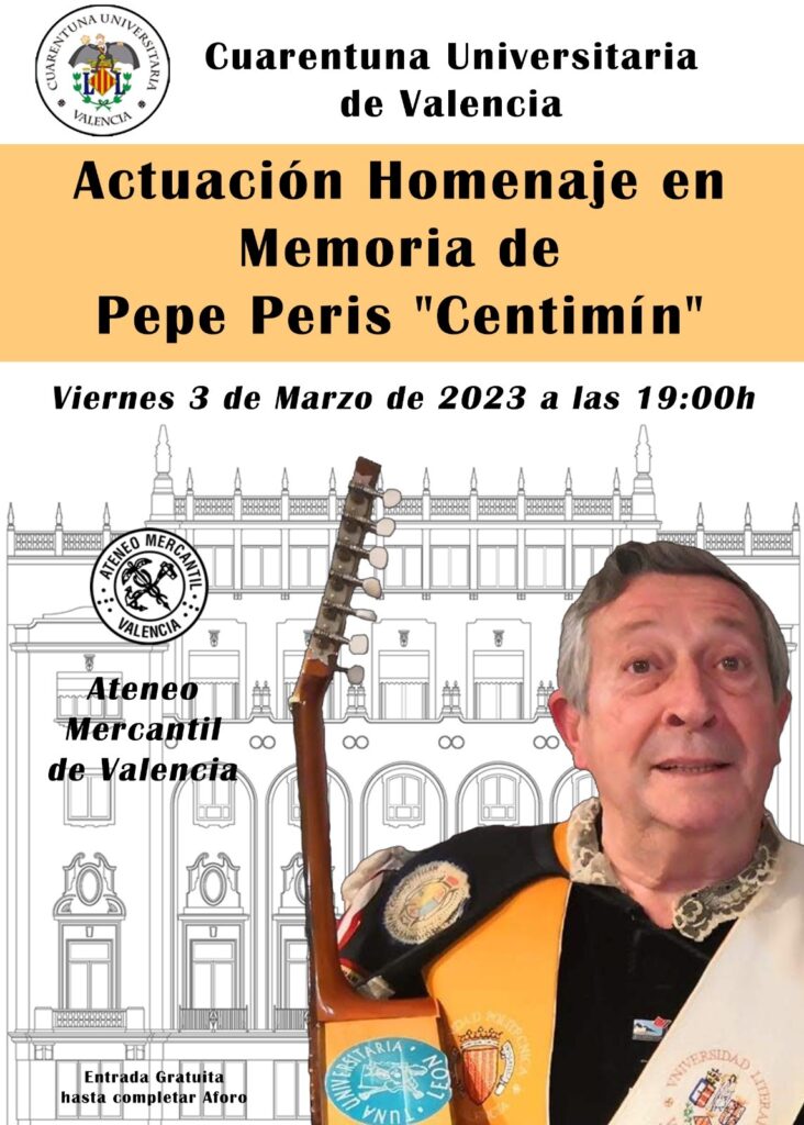 La Cuarentuna Universitaria de Valencia ha programado un concierto gratuito en memoria de Pepe Peris "Centimín" en el Salón de Actos del Ateneo Mercantil de Valencia que servirá de sentido homenaje al mismo. Así el próximo viernes 3 de marzo de 2023 a las 19 horas se celebrará esta actuación de este grupo de antiguos tunos de la Universidad Literaria y de la Politécnica de Valencia.