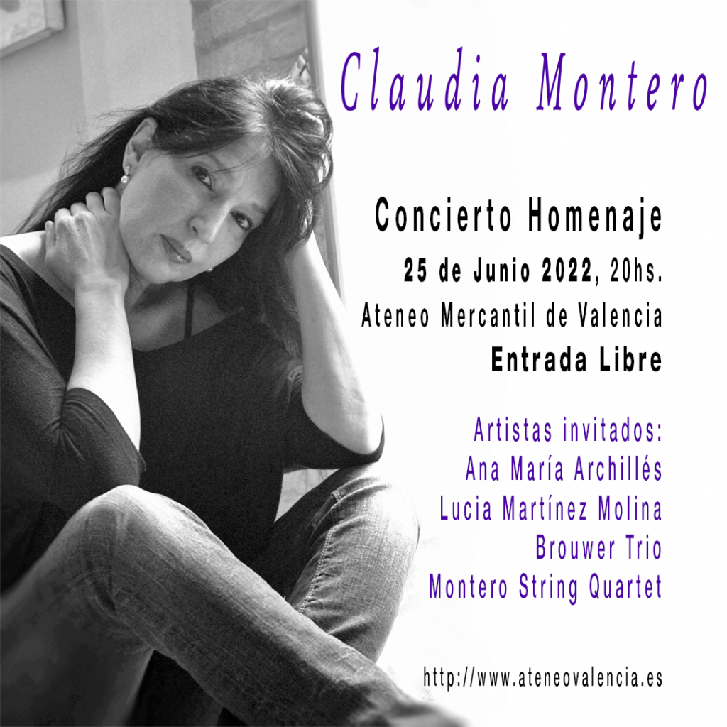 El mes de junio siempre fue especial para Claudia Montero. Su concierto homenaje se llevará a cabo en el Ateneo Mercantil de Valencia, el próximo sábado 25 de junio a las 20 horas en el Salón de Actos. Un concierto en el que participarán músicos con un increíble talento y que son amigos muy queridos de Claudia Montero. Ellos son Ana María Archilés Valls, Lucía Martínez Molina, el B3:Brouwer Trio y el Montero String Quartet.