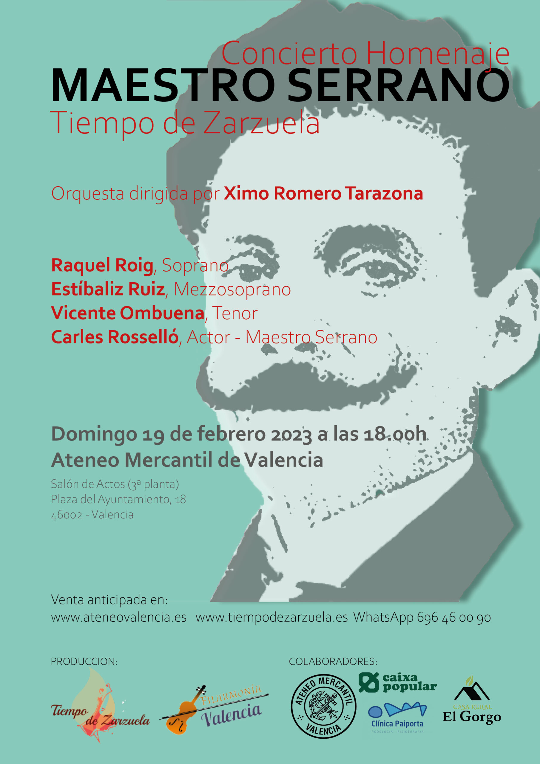 Con motivo del 150 Aniversario del nacimiento del “Maestro Serrano” la compañía “Tiempo de Zarzuela” les presenta este Concierto-Homenaje al compositor más importante que ha dado Valencia.