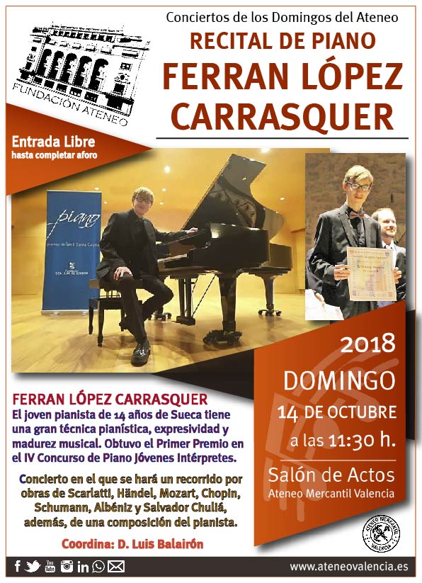 El próximo domingo 14 de octubre regresan los Conciertos Gratuitos al Ateneo Mercantil de Valencia con un recital de piano a cargo de D. Ferran López Carrasquer. Se interpretarán obras de Scarlatti, Händel, Mozart, Chopin, Schumann, Albéniz y Salvador Chuliá, además, de una composición del pianista.
