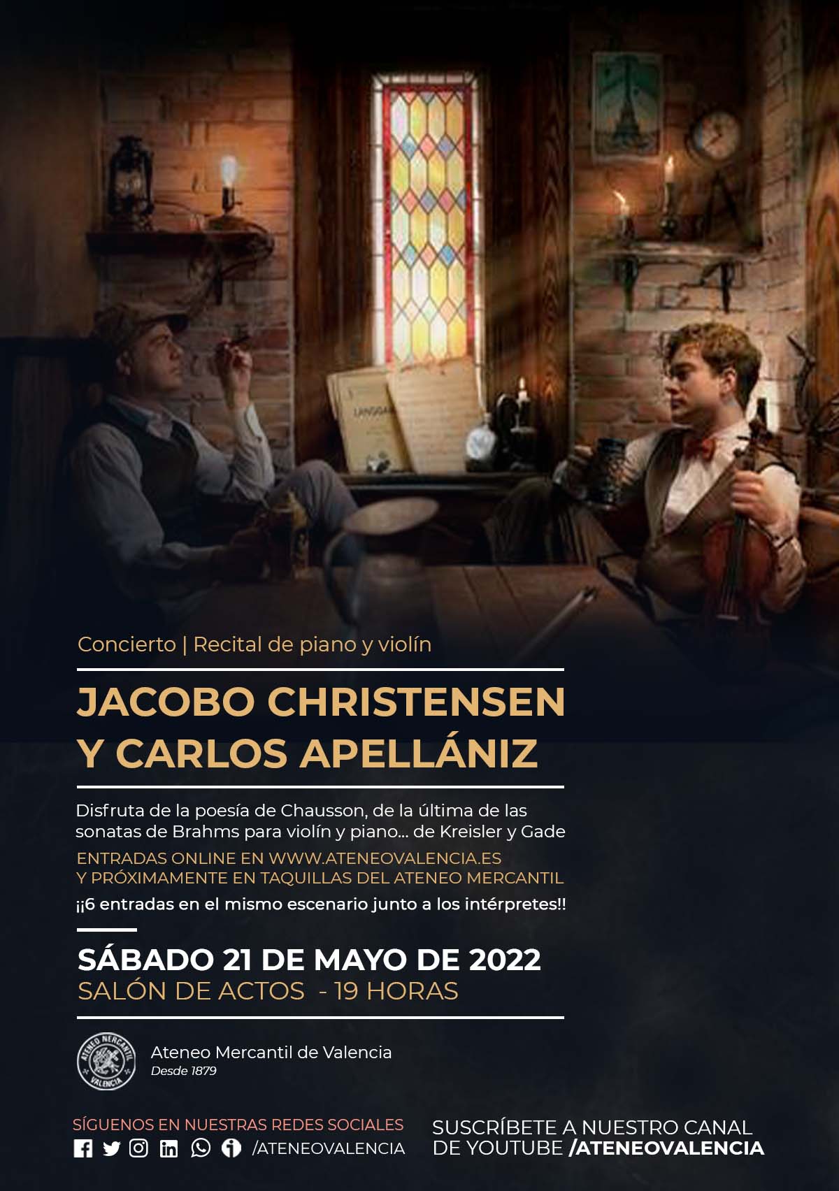 El Ateneo Mercantil de Valencia presenta el próximo sábado 21 de mayo a las 19 horas en su Salón de Actos este precioso recital de violín y piano en el que se podrá disfrutar de la poesía de Chausson, la agitación estremecedora de la última de las sonatas de Brahms para violín y piano y el virtuosismo, frescura y sensualidad de Kreisler y Gade.