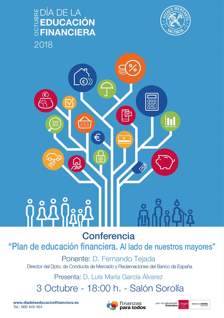 Este mes de octubre se celebra el Día de la Educación Finaciera 2018, la que es la cuarta edición del evento, y para conmemorar esta jornada se va a celebrar en el Ateneo Mercantil de Valencia el próximo miércoles 3 de octubre a las 18.00 horas en el Salón Sorolla una conferencia que llega bajo el título: “Plan de Educación Financiera. Al lado de nuestros mayores” y que correrá a cargo del Director del Departamento de Conducta de Mercado y Reclamaciones del Banco de España, D. Fernando Tejada. Un acto para nuestras personas mayores. Como así indica el cartel de la ponencia, un árbol frondoso del que brotan calculadoras, huchas, simuladores… símbolos, en definitiva, del ahorro, la planificación y la gestión racional de las finanzas personales. Bajo su enorme copa en la que todos buscamos refugio.