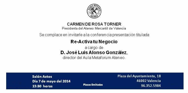 El próximo 7 de mayo, José Luis Alonso, director del Aula Metaforum Ateneo, ofrecerá la conferencia presentación del curso ‘Re-Activa tu Negocio’. La charla tendrá lugar en el Salón de Actos del Ateneo. Entrada libre hasta completar aforo.