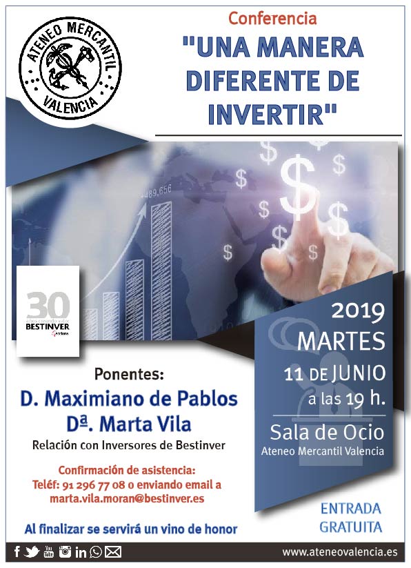 El próximo martes 11 de junio a las 19 horas se celebrará en la Sala de Ocio una conferencia sobre inversión que llega bajo el título: "Una manera diferente de invertir" y que organiza Bestinver.
