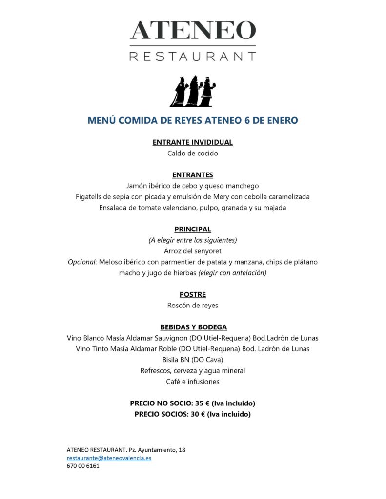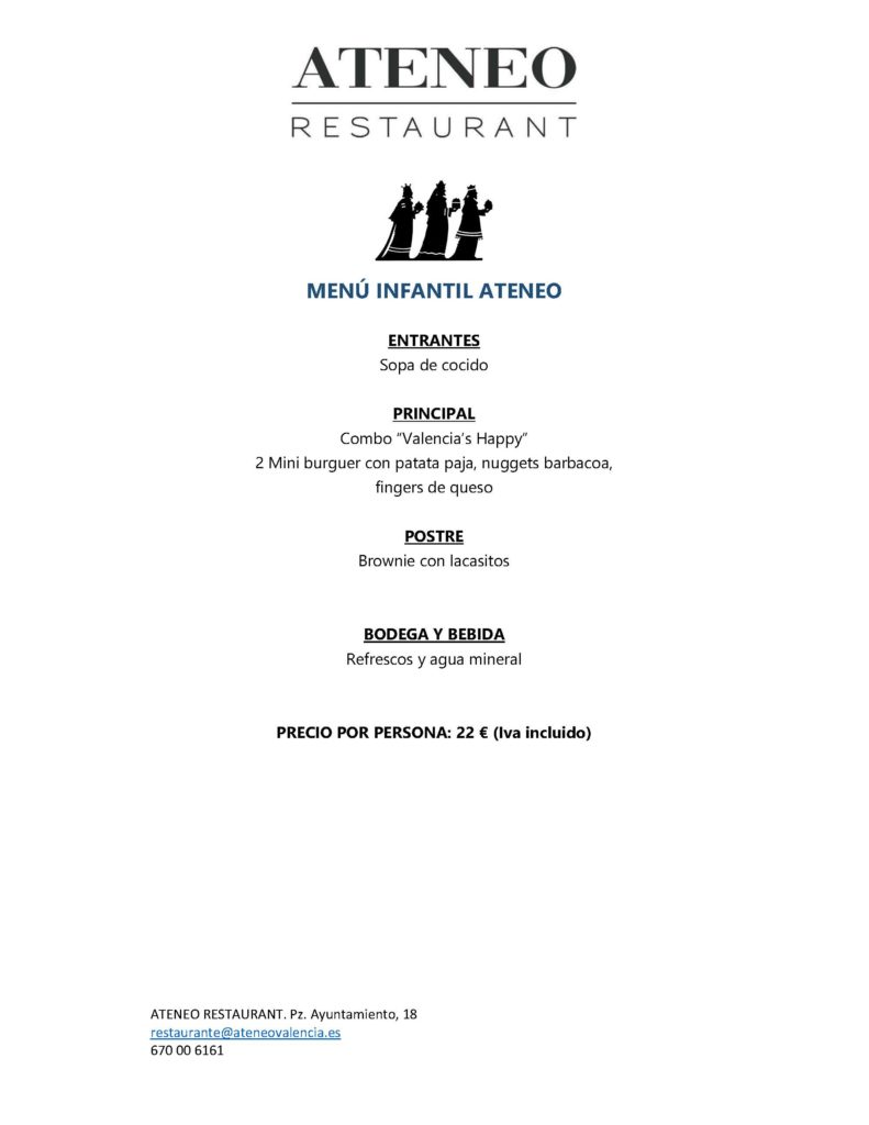La mejor restauración de estas Navidades llega de la mano del Restaurante del Ateneo. El Grupo El Alto ha dado a conocer los dos menús que ofrecerá en la comida de Reyes, el de adultos como el infantil. Recuerda que ya puedes reservar tu plaza en el Ateneo Mercantil para comer el día de Navidad. Las reservas ya se pueden hacer en el propio Restaurante (sexta planta del edificio) o bien reservando en el teléfono 96.293.55.70 y 670.00.61.61.