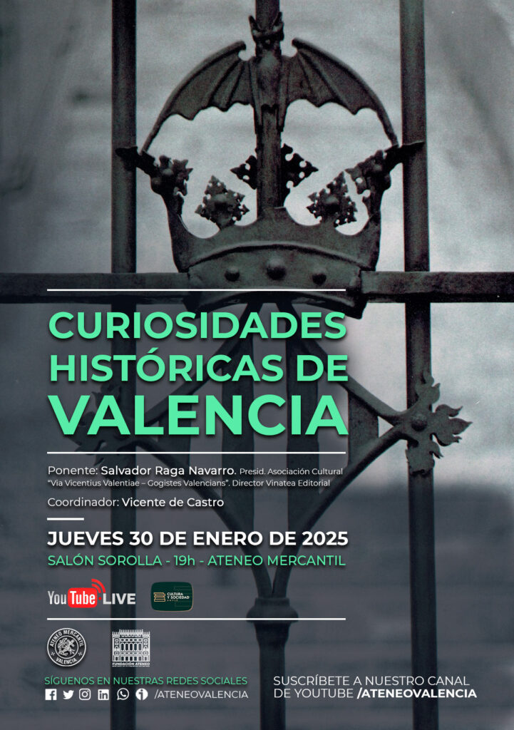 Salva Raga nos trae una conferencia en la que nos descubrirá curiosidades históricas de Valencia durante toda su historia. La Valentia romana, que fue fundada en una isla del río Turia y que tenía una ubicación estratégica por su suelo fértil, o su circo romano que ofrecía espectáculos vibrantes parecidos a los eventos deportivos actuales. Curiosidades como que el sepulcro de Jaime I el Conquistador contiene dos cráneos debido a la mezcla de restos tras un asalto.