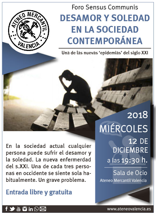 El Foro Sensus Communis regresa a la Sala de Ocio este miércoles 12 de diciembre a las 19.30 horas y el tema a tratar volverá a ser: “El desamor y la soledad en la sociedad contemporánea”. Segunda cita de una conferencia que tuvo un lleno espectacular el pasado mes de noviembre y que contó con Antonio Lastra y Carlos Climent como presentadores del acto. De nuevo, ambos estarán en esta segunda cita que tendrá la modalidad de debate abierto como viene siendo habitual,