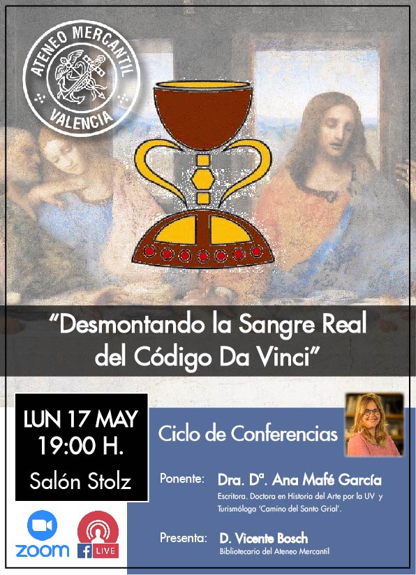 Nuevo encuentro del Ciclo de Conferencias en el Ateneo Mercantil de Valencia el próximo lunes 17 de mayo a las 19 horas. Una conferencia que será presencial en el Salón Stolz y se retransmitirá de manera online a través de Zooom. Llega bajo el título: "Desmontando la Sangre Real del Código Da Vinci" y la ponente será la escritora, doctora en Historia del Arte por la UV y turismóloga ‘Camino del Santo Grial’, Dª. Ana Mafé García.