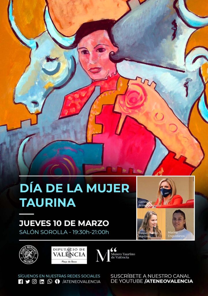 El próximo jueves 10 de marzo, la Tertulia Taurina del Ateneo Mercantil junto a la Diputación de Valencia y el Museo Taurino de Valencia se sumarán a los distintos actos reivindicativos en el Día Internacional de la Mujer, con la celebración de la conferencia "Día de la Mujer Taurina" a las 19 horas en el Salón Sorolla, en forma de homenaje a las mujeres toreras. Un acto que contará como invitadas con Genoveva Armero Simarro (Presidenta de la Plaza de Toros de Albacete), Marina Enguídanos Cabanes (fundadora y presidenta de la "Penya V.A.C" de Llíria) y la periodista Raquel Barba Martínez (Redactora en Aplausos, información especializada en tauromaquia).