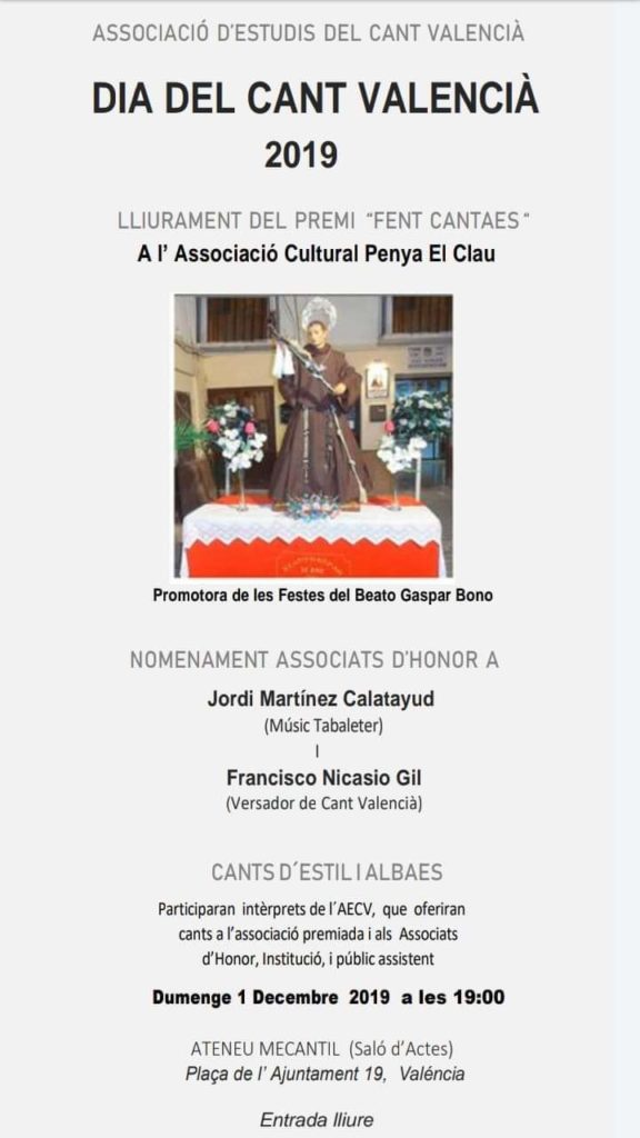 L'Associació d’estudis del Cant Valencià celebra este domingo 1 de diciembre el Dia del Cant Valencià 2019 en el Salón de Actos del Ateneo Mercantil de Valencia a las 19 horas. Un acto en el que se realizará la Entrega del Premio "Fent Cantaes" a l'Associació Cultural Penya El Clau y se nombrarán Asociados de Honor del Cant Valencià al músico tabaletero Jordi Martínez Calatayud y al versador de Cant Valencià Francisco Nicasio Gil. Además, se harán Cants d'Estil i Albaes en honor de los premiados, de la Associació d'Estudis del Cant Valencià y el público asistente.