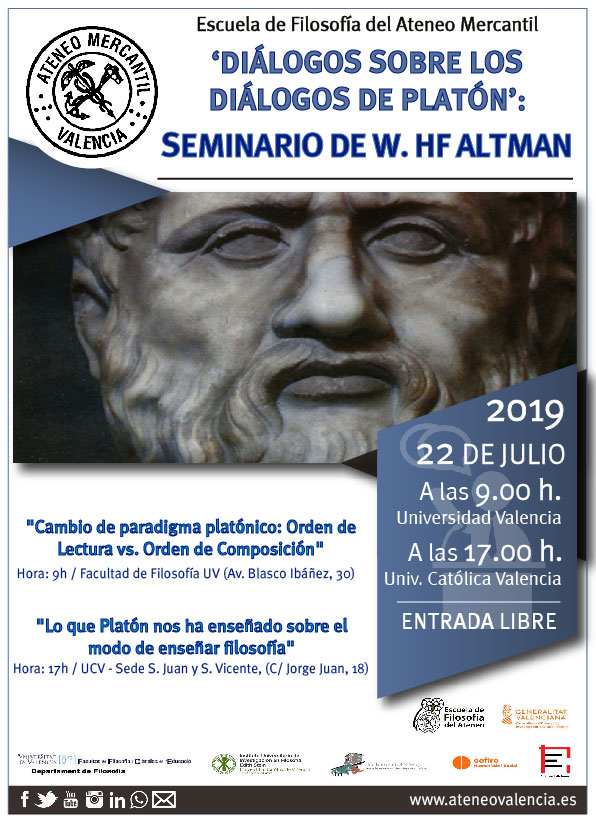 La Escuela de Filosofía del Ateneo Mercantil en colaboración la Consellería de Educación, el Departamento de Filosofía de la Universidad de Valencia, el Instituto Universitario de Investigación en Filosofía Edith Stein de la UCV y el Instituto de Estudios Culturales Avanzados La Torre del Virrey han desarrollado un importante Seminario que se impartirá el próximo mes de julio en Valencia dentro de la propuesta filosófica 'Diálogos sobre los Diálogos de Platón II' y bajo la dirección de los profesores el Dr. Juan Antonio Negrete y el Dr. Antonio Lastra.