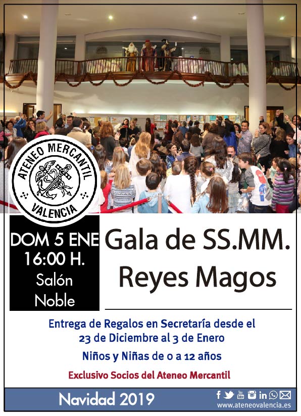 Sus Majestades los Reyes Magos de Oriente llegan de nuevo a Valencia este domingo 5 de enero para repartir regalos entre los niños y niñas ateneístas que tengan entre 0 y 12 años, pero antes de desfilar en la cabalgata que recorrerá las calles de la ciudad, como viene siendo tradición, primero serán recibidos en el Ateneo Mercantil para dar una sorpresa y repartir ilusión entre los más pequeños de nuestros socios. La novedad es que este año regresan a nuestro salón más grande, al Salón Noble, para que muchos más niños puedan participar en la recepción oficial de SSMM los Reyes Magos. La hora de inicio será a las 16 horas.
