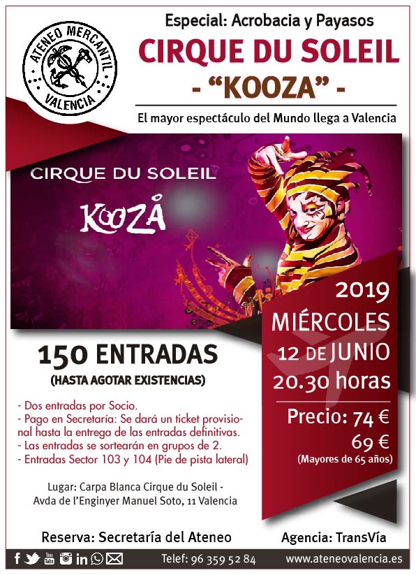 El mayor espectáculo del Mundo llega a Valencia con el Cirque du Soleil y el Ateneo Mercantil no puede fallar ante tal cita y por eso se disponen de 150 localidades pora nuestros socios que quieran ver el nuevo espectáculo 'Kooza', un homenaje al circo tradicional. De regreso a los orígenes, Kooza combina arte y acrobacias de payasos al tiempo que explora el miedo, la identidad, el reconocimiento y el poder. El viaje del inocente lo lleva a encontrarse con personajes cómicos de un mundo electrizante lleno de sorpresas, aventuras, audacia y total participación.