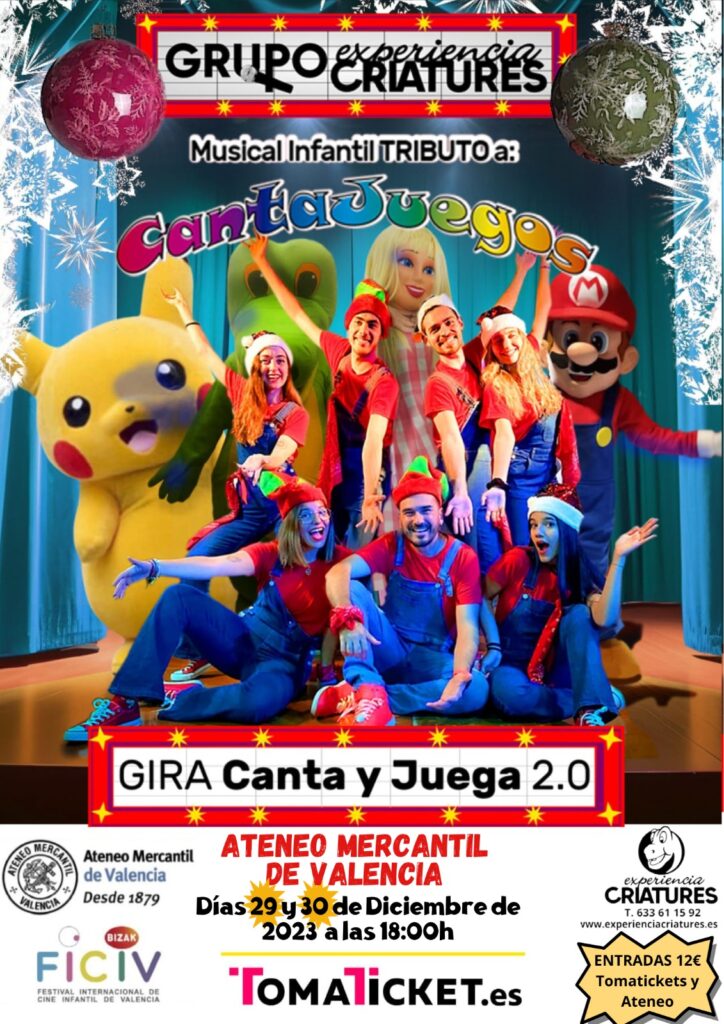 El Ateneo Mercantil de Valencia acoge estas Navidades el Musical Infantil 'Tributo al Cantajuegos' los días 29 y 30 de diciembre en el Teatro Ateneo dentro de la Gira Juega y Canta 2.0 que está realizando el Grupo Experiencia Criatures por todo el país. Un musical infantil inspirado en el famoso grupo Cantajuego. Un tributo que integra en su play list canciones infantiles con canciones juveniles actuales y con temas más antiguos que han permanecido en la memoria de todas nuestras generaciones. Cantajuegos 2.0 te hará cantar, jugar y, sobre todo, divertirte en familia.