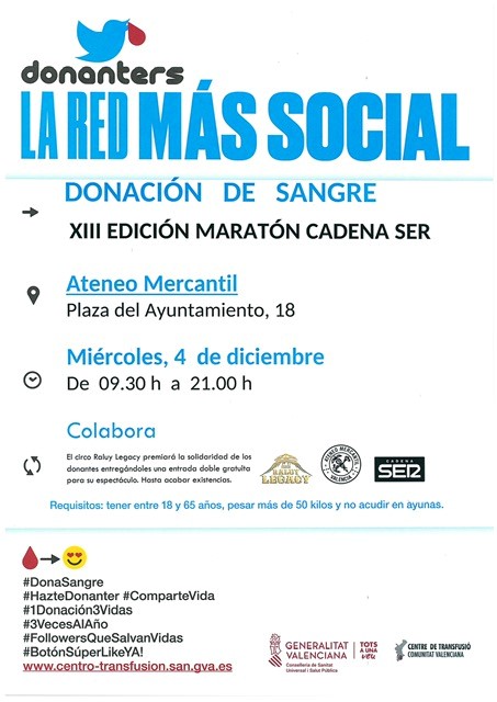 Ya es un clásico de las Navidades en el Ateneo Mercantil, el Maratón Solidario de Donación de Sangre de Radio Valencia Cadena Ser llega a su XII edición  que cuenta con la colaboración del Centre de Transfusions de la Comunitat Valenciana (CTCV), el Ateneo Mercantil de Valencia y del Circo Raluy Legacy, que entregará entradas para su espectáculo hasta acabar con las invitaciones.