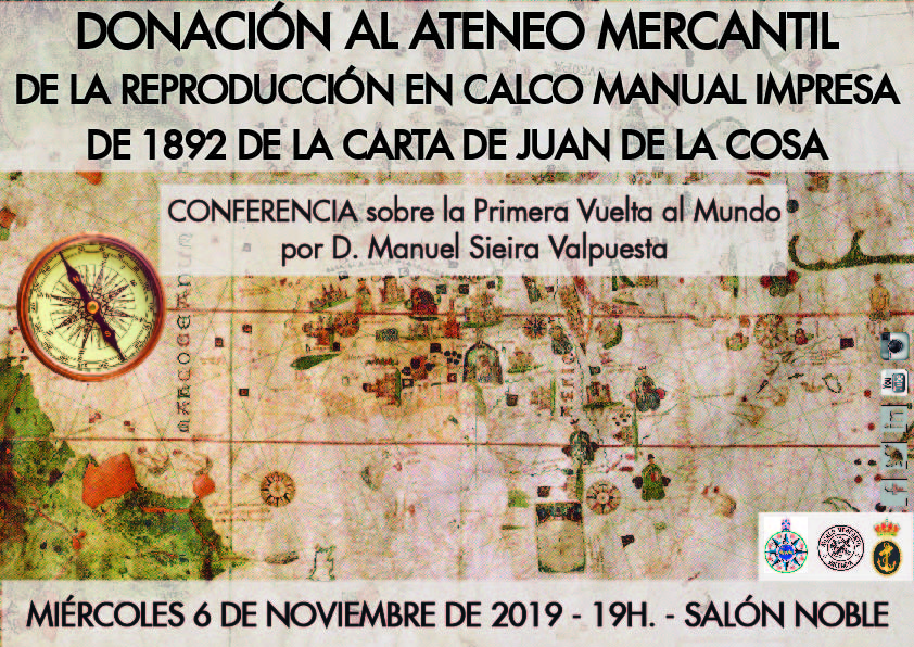 Este próximo miércoles 6 de noviembre a las 19 horas en el Salón Noble se producirá el acto de entrega de un mapa muy especial, la Carta de Juan de la Cosa, que ha sido posible gracias a la Asociación de la Carta de Juan de la Cosa y a las Milicias Navales Universitarias. Lo que se dona con sumo cariño al Ateneo Mercantil, por su participación de manera oficial al programa de actos que se desarrollarán por toda España coincidiendo con el V Centenario de la salida de la expedición Magallanes-Elcano desde Sanlúcar de Barrameda, es  una reproducción en calco manual impresa de 1892 de la carta de Juan de la Cosa.