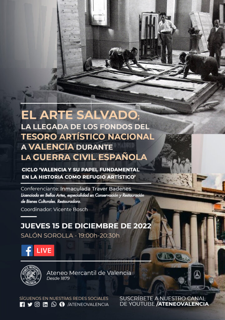 El Ateneo Mercantil de Valencia ha organizado una conferencia para el próximo jueves 15 de diciembre a las 19 horas en el Salón Sorolla que nos desgranará el salvamento del patrimonio artístico español y de la intervención internacional que sucedió en la Guerra Civil para tratar de proteger y evacuar del patrimonio artístico nacional, así como la intervención de las instituciones internacionales para evitar su destrucción y garantizar su conservación. La conferencia se engloba dentro del Ciclo 'Valencia y su papel fundamental en la historia como refugio artístico".